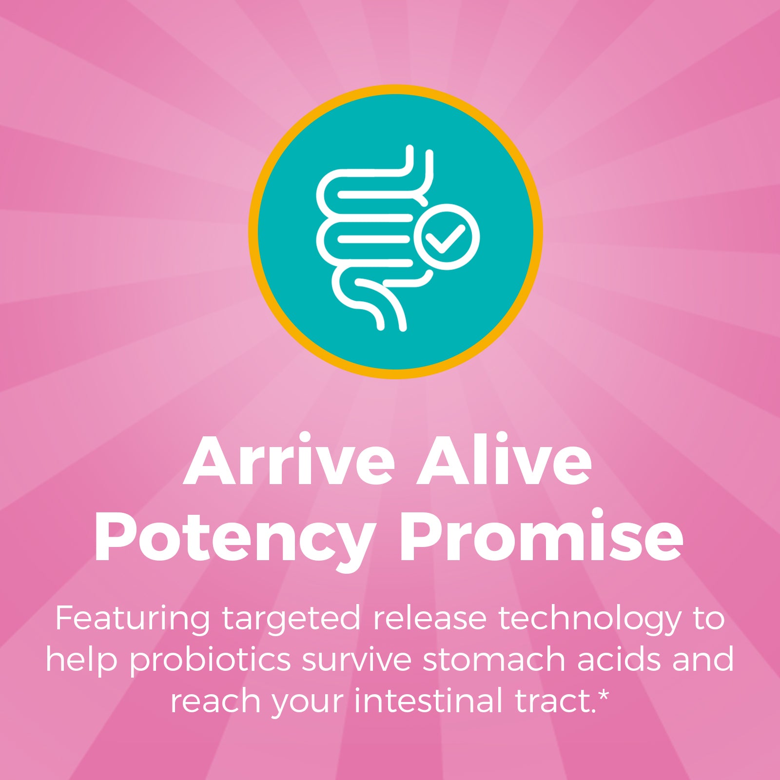 The "Arrive Alive Potency Promise" assures our probiotics' effectiveness via targeted release technology. It ensures beneficial probiotics survive the digestive system's harsh conditions and arrive in the gut alive and active.